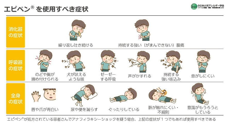 日本小児アレルギー学会の指針では、以下の症状が1つでもあれば、迷わずエピペンを使用すべきとされています。